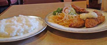 | 昼ごろだったので、玉造筋を走って右にコーヒーハウス薔薇という店に入った。サカナフライの定食を頼んだ。ボリュームたっぷりだ。 店内も広く落ち着く。新聞や雑誌も読めるし。 |
