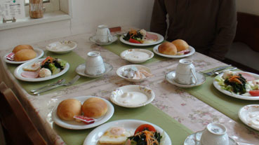 | 泊まった部屋のベランダに出た。 | 朝食はパンとコーヒーだ。 | ||||||