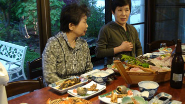 夕食は、海の幸でいっぱいだ。カニやエビ、刺身など。 | |||||||