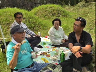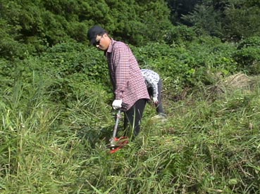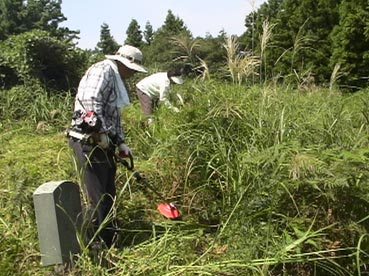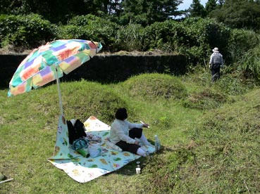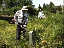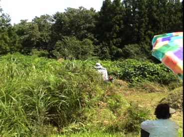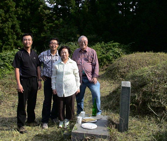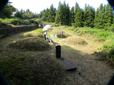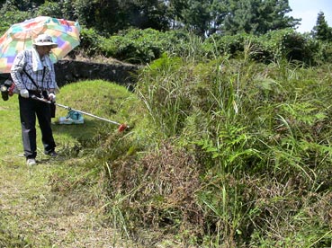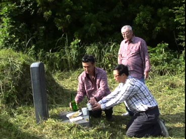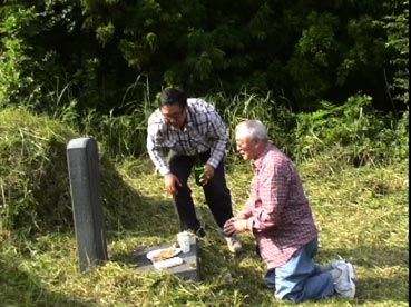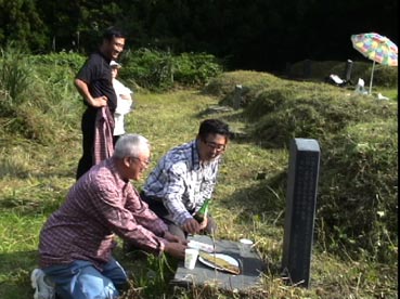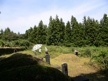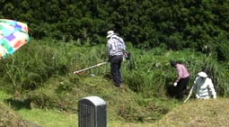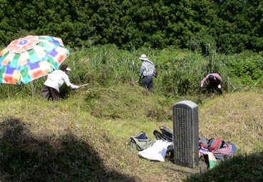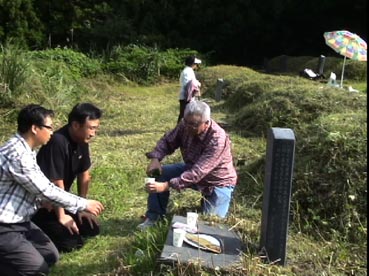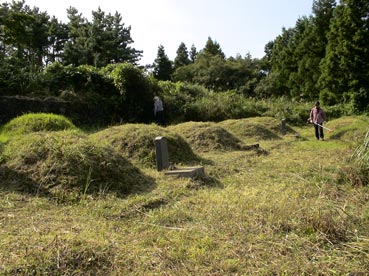 ひと通り草刈りが終わって、墓に向かって挨拶だ。 |
