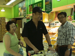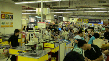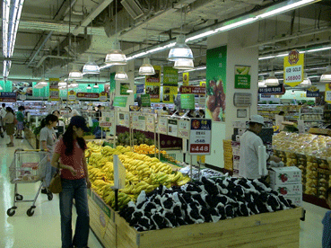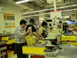 広いスーパーで、何でもそろう。 |