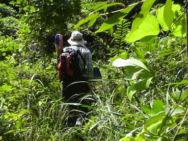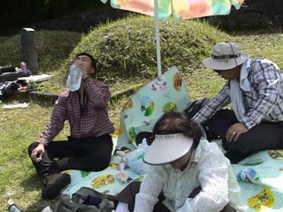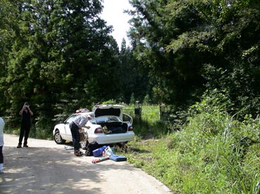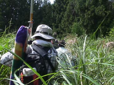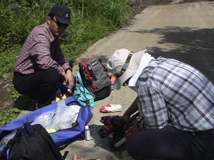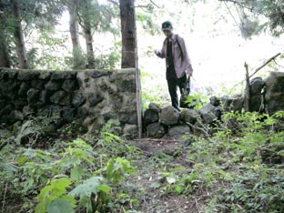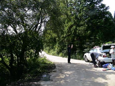 | 墓のあるところへ出発。場所は梧登洞だが、車で途中まで行き、あとは道のないところを歩いて進む。 |