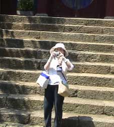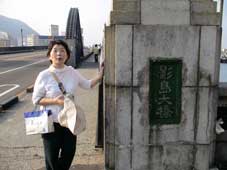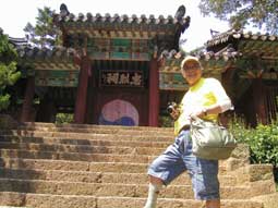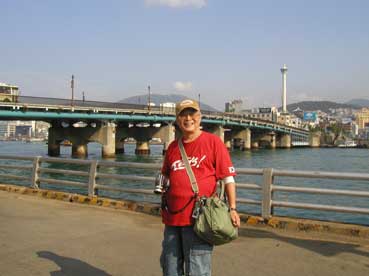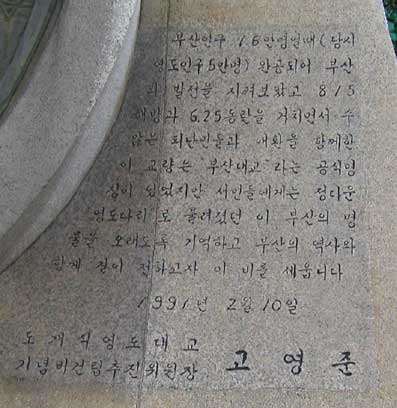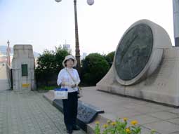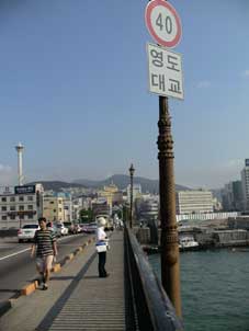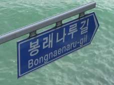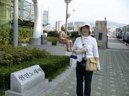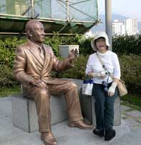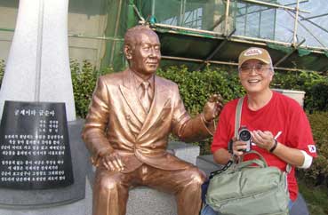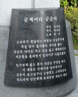 橋を渡ろうとしたところにおっさんの像があった。これは、玄仁といって、昔の歌手である。 この人が歌った「クッセオラクンスナ」という歌の歌詞が刻まれていて、そばに近づくとその歌がなり出した。 |