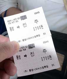 | これがバスの切符。ジンジュまで5700ウオン(約570円) | |||||||||||||