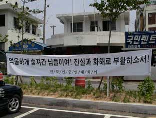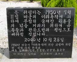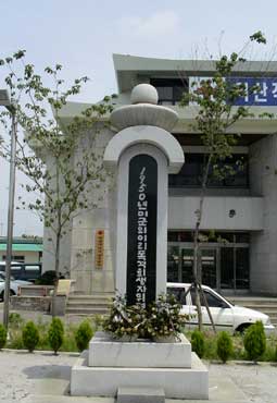 益山駅にはこのような祈念碑があった。 1950年7月11日、米軍の裡里爆撃により無惨に命を落とした「たまし」のため、遺族と全北の道民の真心で建てられたもの。2000年10月28日とある。 |