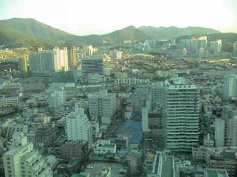 | ロッテホテル33階の部屋の窓から見る釜山市の景色。 | |||||||||||