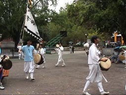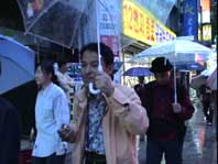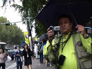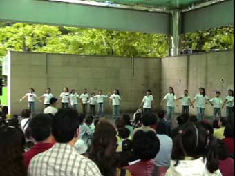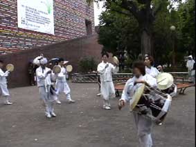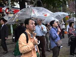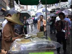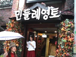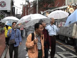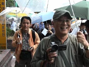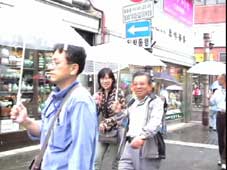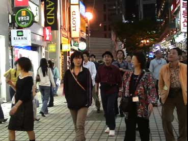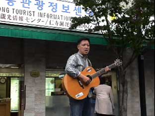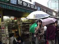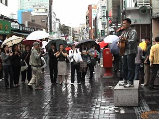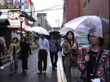 | ソウル市内へ向かう途中、左手に国会議事堂、全面鏡張りの金色をした韓国一高いビルが見える。63階あるので、63ビルという。韓国の交通は日本とは反対の右側通行、ナンバープレートも緑地に白抜きとなっている。空港を出たのは確か12:50分頃、14:00頃昼食となった。 昼食はうどんすきを食べる。うどんといっても麺は日本のラーメンに似ている。バスの中で宋さんが、韓国に来て韓国のものを食べると匂いが気にならなくなると話してくれた。ちなみに日本はタクアンの匂いがするらしい…。 昼食をすませて外に出ると雨がポツリポツリと落ちはじめる。最初の見学地は「大学路」だ。移動中、南山のトンネルを通ったが南山には3つのトンネルがあって普通車は2つが有料だそうだ。市内はバスを多く見かけるが、慣れないとややこしいらしい。バスから見える家々に黄色いタンクが見えるが、水を溜めておくタンクだそうだ。 韓国の子供たちは英語をしゃべれるがLとRの発音ができなくて舌を手術する子供もいるとか、日本では稀なことですね。 15:00すぎに大学路到着、傘をさしながらの見学となった。大学路は文字どおり学生の街なのだろう。若いカップルは皆、相合い傘で肩を寄り添って歩いている。うらやましい…(笑)。 |