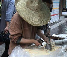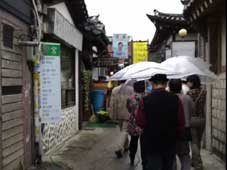 | 15:40、大学路を出てバスで10分くらい「仁寺洞」に移動する。傘をさしての散策は少し残念でしたが、こればかりは仕方ない。雨が降っていても人はいっぱい。晴れていればもっと人が多いだろう。通りには露店も出ていて、歩く人たちの足を止める。私も飴切りの露店で足を止めた。日本では縁日くらいでしかお目にかかれない光景だ。お茶を飲もうと茶店に入る。何か変わった民族茶でも飲もうとそれぞれ注文するが、どれも甘〜いお茶だったみたいだ。私は暖かいゆず茶を頂いたが、砂糖湯を飲んでいる感じだった。茶店を出て大きな本屋「教保文庫」に向かう。途中裏道を通った。ピマッコルという。この裏道は昔、表通りを偉い人が通ると頭を下げなければならず、時間がかかってしまうため、この道を通ったそうだ。本屋で買い物をしたあと、バスでホテルに向かう。 | ||||||||||||||||