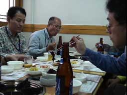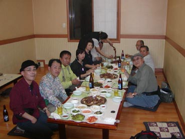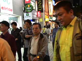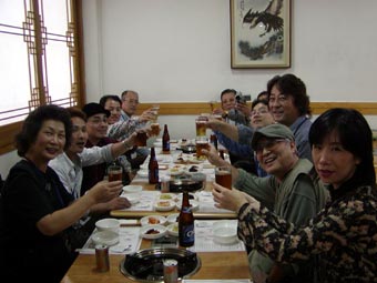 | 18:00頃アストリアホテルに到着、チェックイン。各自部屋に入って荷物をほどき、19:00夕食へ。外に出ると雨は既にあがっていた。夕食はカルビを食べる。 バスの中で宋さんから食べ方を聞くが日本でもお馴染みだ。ただし、日本より遥かにバランスの良い食材となっている。カルビは丸く巻かれてタレにつけ込まれている。見た目はグロテスクだがマシソヨ。ビールの多くはOBビール。日本のビールより軽めの味で喉越しがよすぎる感じだ。 20:20すぎ夕食がすんで、バスの中で翌日の説明を聞く。20:40「明洞」でバスを降り、歩いて帰ることにする。 明洞は大阪でいうとミナミのようなところかな?。カラオケ(ノレバン)に行こうということなって、高さんがお店を探してくれる。街は人々でにぎわっている。 21:00カラオケの店に入る。気候が涼しくなってビルのクーラーを切ってしまったとのことで、中はとても暑い。ノレバンは飲み物などは自動販売機で買って持ち込みだ。日本語の曲もあるが、横山さんが最初にアリランを歌う。続いて清水さんが熱唱、いい声してましたね。 皆それぞれ歌ってカラオケを出たのは22:20頃か。歩いてホテルまで…。 途中、高さんがソウルに来るといつも入るというおすすめのお店に入る。お店の名前はタロクッパブチプだったかな?。しかし皆さんよく食べましたね。私はもうおなかがいっぱいでした。 明洞を離れホテルに戻る途中、ライトアップされた南山タワーが見える。23:30ホテルに戻る。私たちはコンビニで買い物をしてからホテルに入った。 |