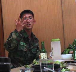 | 若い韓国軍兵士がとなりに座っていた。 彼は「1日に20キロの荷物を担いで40キロ歩く」と話した。訓練はきびしいようだ。 |