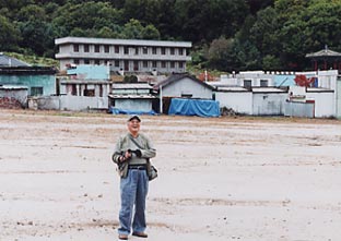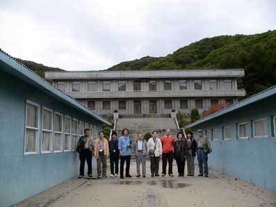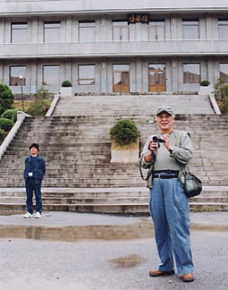 | 板門店の軍事境界線上に立って。 後ろに見えるのが北側 |