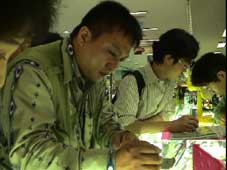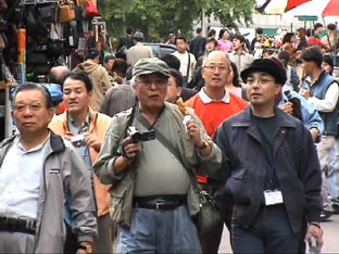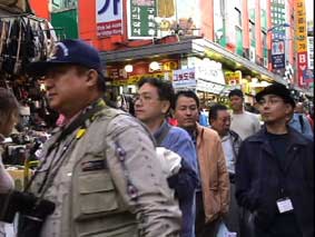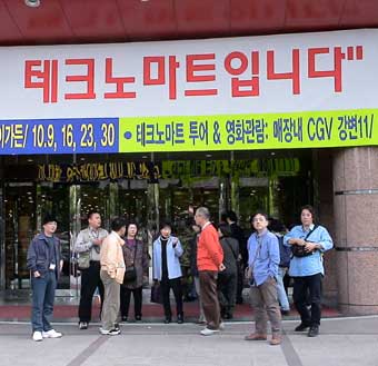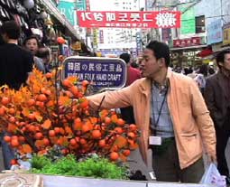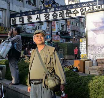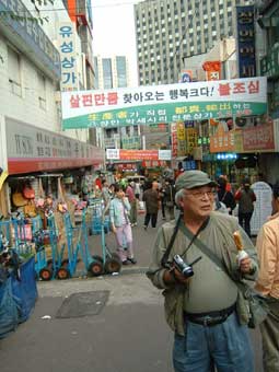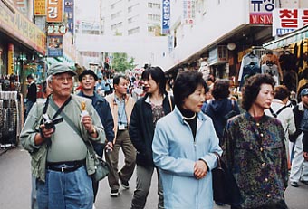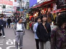 約一時間昼食のあと、「テクノマート」に移動。テクノマートはとてもとても広いところで、電訳辞書やDVD・CDなど見て回る。 15:30分すぎ、テクノマート出発して「南大門市場」へ向かう。16:15分、南大門市場に到着。 南大門市場を見学しながらの買い物だが確かに広い。人も多いがお店も多い。お店の人はみんな日本語でしゃべりかけてくる。一件入ったお店は、日本語の上手なお兄さんが面白い語りで売っている。つられて韓国のりや高麗人参など買い物。それから露店で買ったトウモロコシなどを食べながら、食の通りを抜けてバスに戻る。あとで地図を見たら通ったところは南大門市場のほんの一角。これは全部回るには何日もかかってしまうだろうな…。だが一角とはいえ雰囲気は味わえたと思う。 |
