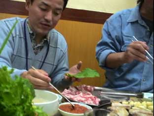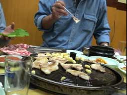 | 12:10、ソウル総合撮影所を出発して13:10昼食。昼食はサムギョプサル、豚のお肉だ。食べ方を教わっての食事。牛肉とは違うので、よく焼いてから食べてくださいとのこと。そして野菜の多さにビックリ。 いろんな種類の野菜の葉っぱを使って、お肉やキムチを巻いて食べるのだが、とてもおいしかった。 |