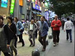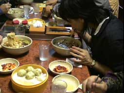 | 17:20南大門市場を出て明洞へ。明洞で夕食にする。カルグクス(韓国式うどん)とマンドゥ(ギョウザ)。入ったお店はミョンドンギョジャ。 ガイド本にも紹介されているらしい。初日に食べたうどんすきよりも日本のうどんに近い。 食事の後18:30〜19:25までは自由行動となった。私は清水さんと岡田さんとでブラブラしたあと、喫茶店でコーヒーを飲んでいた。二階の窓から街を見ると道頓堀の喫茶店に座っているかのような感じがした。 |