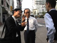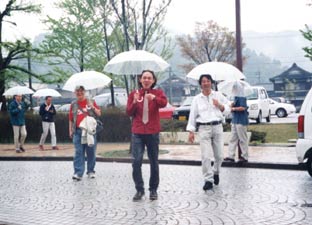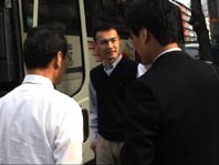 | 担当幹事の河手さんは早くから桃谷駅近くの集合場所で、旅行社の人や観光バスの運転手さんと打ち合わせをする。 |