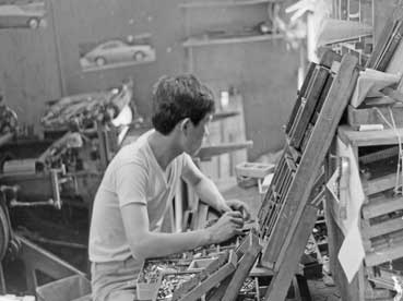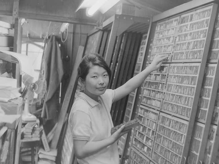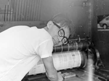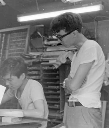 | バンジャ(現在の専務)が文選を行った。 | 私は手差し印刷機で印刷をする。 | |||||||