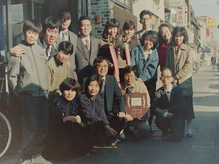 1989年新年会を終えて。大写協ソフトボール大会で優勝。レックス会ボーリング大会優勝杯を持って。