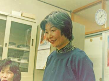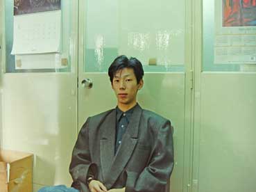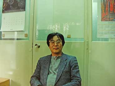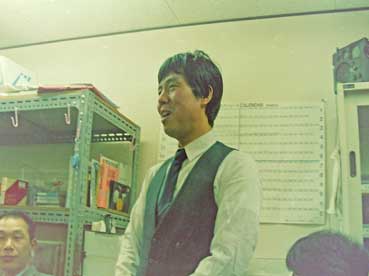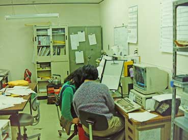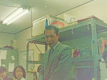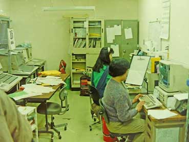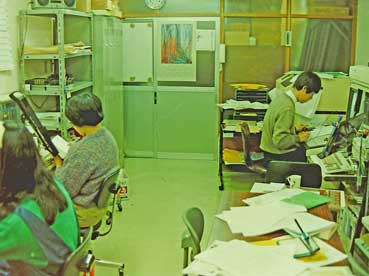 | 奥のドアが電算室の出入り口だ。ドアのガラスには僑文社20創立20周年のカレンダーが貼られている。 右に座って作業をしているのは鄭炳采部長、モリサワ電算の組版を行っている。鄭部長の奥にあるのが、リョービ・レックス出力機。 |