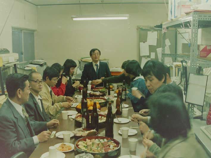 1988年1月新年会を終えて。東京支社長もいる。みなさん若いですね。