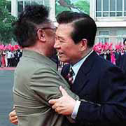 김대통령의 평양 출발에 앞서 포옹하고 있다.