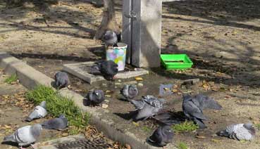 | ハトたちが井戸端、いや水道のそばでたむろしている。 | |||||