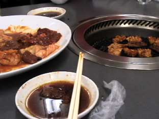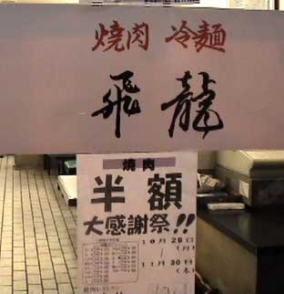 | 狂牛病騒ぎのため、焼き肉屋はお客がめっきり減って、死活問題を起こしている。それで、森町にある「飛龍」も例外ではない。 半額セールをしていたので、私たちはここで焼き肉を食べる事にした。 |