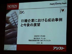 | 主催 韓国ソフトウェア振興院(KIPA) 協力 大阪府、大阪外国企業誘致センター 日時 平成14年11月29日(金) 16:00〜(受付開始15:30より) 場所 帝国ホテル大阪(孔雀の間東) 大阪市北区天満橋1-8-50 |