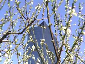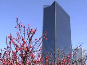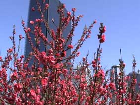 赤いももの花、ビジネスパークの高層ビルがバックに何ともいえない。