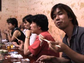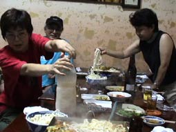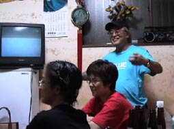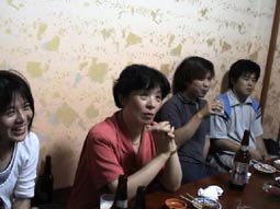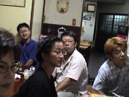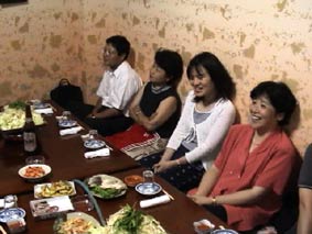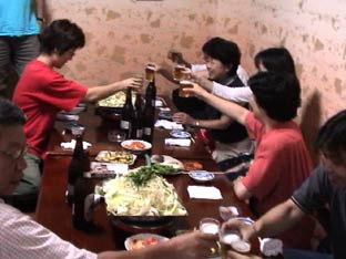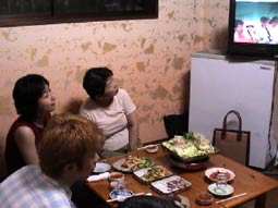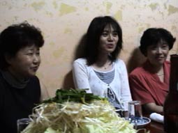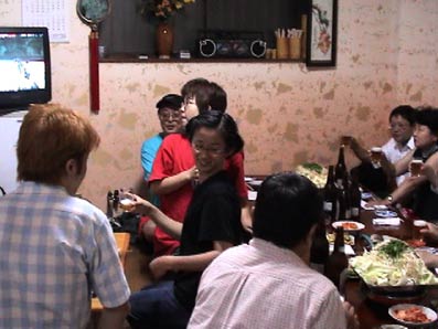 てっちゃん鍋や、マッコルリ(私はビールだけだが)を飲みながら、わきあいあい、楽しいひとときを過ごした。 北京のビデオでは、自分の姿がテレビ画面に現れると、喜んだり、恥ずかしかったり。 平壌のビデオには、驚いたり、感嘆したり。 |