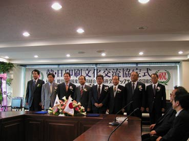 | 9月15日から3日間、大阪グラフィックサービス協同組合(OGS)の岡理事長をはじめ、メンバー10人が、ソウル軽印刷情報産業協同組合と、姉妹結縁を結ぶ為に、ソウルを訪問した。 16日午後5時半から、ソウルの中区にある印刷情報センターの講堂で協定の調印式が行われた。ソウル副市長や韓国の印刷関連団体の関係者が参加する中で、盛大に、本当に盛大に行われた。 9월15일부터 3일간 오사카그래픽서비스협동조합(OGS)의 오카 이사장을 비롯하여 회원 10명이 서울경인쇄정보산업협동조합과 자매결연을 맺고자 서울을 방문하였다. 16일 오후 5시반 부터 서울중구에 있는 인쇄정보센터 강당에서 협정의 조인식을 가졌다.서울부시장을 비롯하여 한국의 인쇄관련 단체 관계자가 참가한 가운데 성대히 정말 성대히 조인식이 거행되었다. |