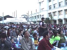 金剛学園小学校、練習のときも真剣だが、本番はより真剣。車千代美先生は舞台のそばで見守りながら指示を出す。