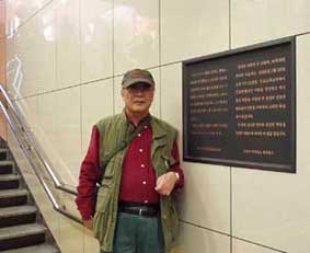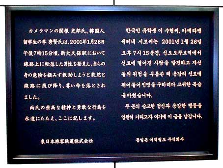 | PAGE2002とは直接関係はないが、会場から近くの新大久保駅にKBSで作成した版下の名盤がホームへ上がる階段のところに飾られていた。それで記念に。 これは2001年1月26日に線路に落ちた人を助けようとして犠牲になった二人を讃えてのもの。 |