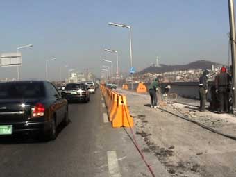| バンポテギョ盤浦大橋の上、右端は工事中であった。自転車が通れる道を作ってくれたらいいのにね。 | ||||||||||||||||||