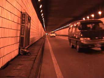 | トンネルの中は比較的に明るかった。自転車が通るような道ではない。しかも車の音がとてもうるさかった。 バスなど大型の自動車が側を通る時はこわい。 まあ、二度と通る気にはならないと思った。 |