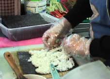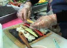 にんじんやコサリ、蒲鉾、ソーセージ、卵焼きなどを入れて巻く。 | ||||||||||||
