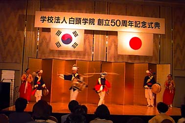続いて金世澤総領事が祝辞に立ち「今日は白頭学院創立50周年の日でなく、永遠なる白頭学院を受け継いでいく始まりの日であるといえます。私たちはこの意義深い日を迎え、これよりより一層ウリマルそして歴史・地理などの文化を後に続く子供たちに正しく教えることによって、歴史に悔いを残す罪人にならないようにしなければなりません。私たち在日同胞が自分たちの主体性を確かなものにすることこそ日本の社会から尊敬される道だといえるでしょう。」と激励した。