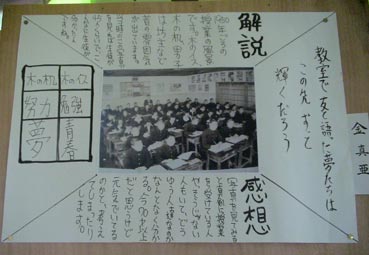 | 2階の展示物に、私たちのクラスの写真があった。もちろん、私の丸坊主の写真も載っていた。 金真亜さん、70歳台じゃないよ。60歳すこし過ぎた年だ。写真は1961年か62年に撮ったものです。 |