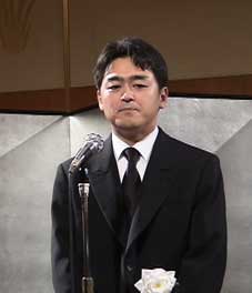 | お礼のことばを述べる、あさひ高速印刷の岡達也新社長 | ||||||||