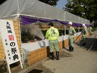 公園職人たちが菊に水をやる。