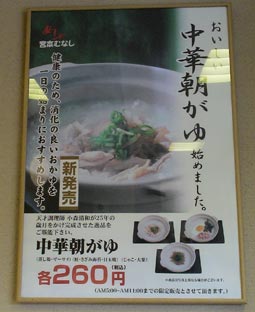 | 桃谷駅前に「めしや」が出来た。帰りにここでおかゆを食べた。260円で、温まるよ。 | |||||