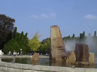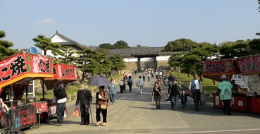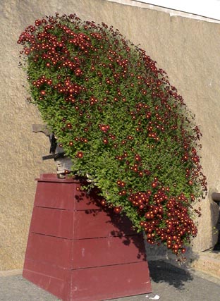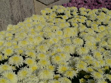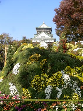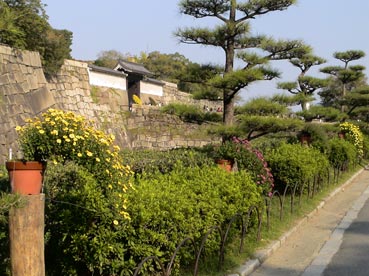 | 大阪城の入り口に飾られている菊の花。左に置かれている黄色の花はもう咲いていた。 右の赤い花は咲き始めていた。 |