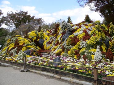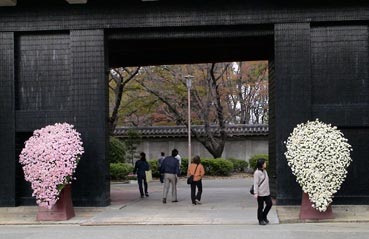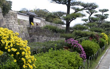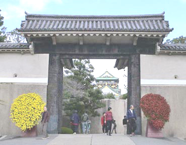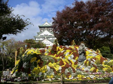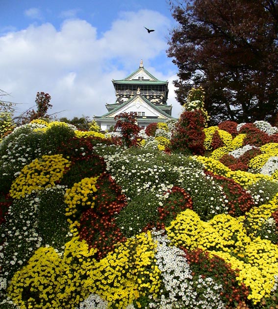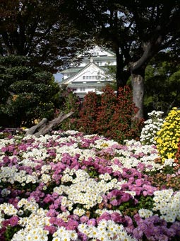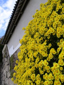 | 大阪城の入り口、多聞櫓(たもんやぐら)前に飾られた菊の花 | ||||||||