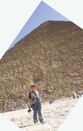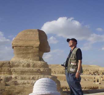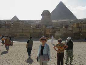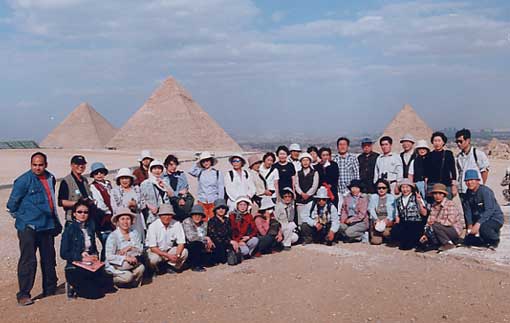 博物館を出て、またバスに乗ってギザのピラミッドがあるところへ。思いかけずカイロ市街地からすぐピラミッドがバスの窓から見えはじめた。巨大な三角の建物というか、すごいものが見えはじめると「おおー」と自分も知らずに声がでる。バスの中では現地ガイドのサブリさんがいろいろとエジプトのことを話してくれた。 |