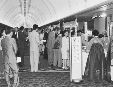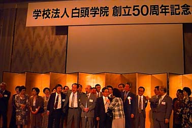 午後3時からは会場をホテルニューオータニに移し内外の来賓を招待して張成秋事務長の司会により記念式典が挙行された。高錫棋校長の開会辞「白頭学院50年の歴史に非常な苦労で関わってこられた多くの先輩たち及び今日この場に参席されたみなさん方の血と汗と涙は我々在日韓国人の貴重な精神的遺産であります。今日創立50周年を契機として私たち教職員一同、本学院のさらなる発展に努力します。」の挨拶で式典が始まった。