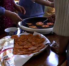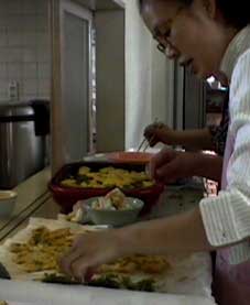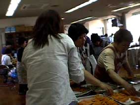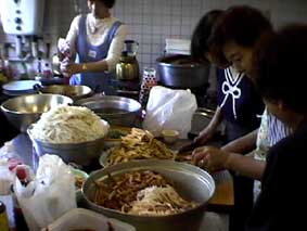 | この日、3時からの祝賀会のための料理づくりに、大阪教会の女性会のオモニたちが腕を振るった。ナムルを作る人、チジミを焼く人、海苔巻きを作る人、などなど、にぎやかだ。 | ||||||||||||||||||