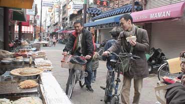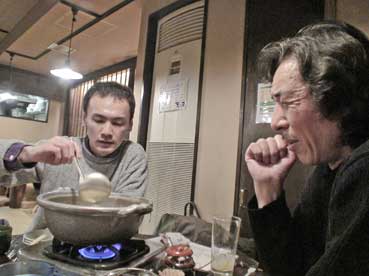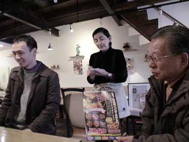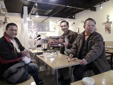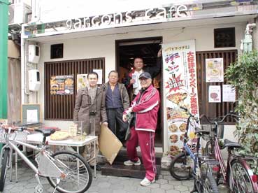 | コリアタウンの平野川近くのしゃれた喫茶店、ここではピザ・チジミを売っている。 なんと、これはフォーラム・アイのアイデアで生まれたという。マスターからワイン1本出してくれた。 |