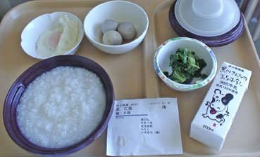 | 手術後夕食の食事。お粥だ。 | ||||||||||