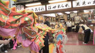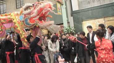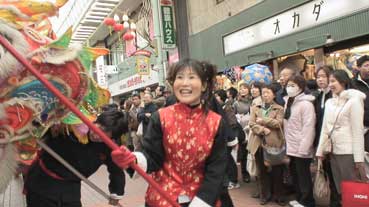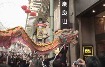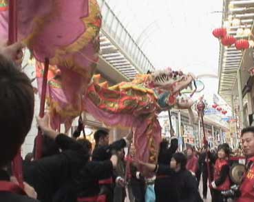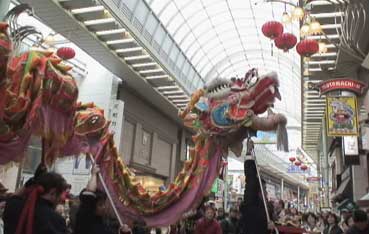 | 龍舞が元町商店街をパレードした。 | 先頭は平尾さんが珠を持って。 | ||||