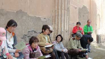 | ポムペイで礼拝を行った。聖歌隊の代わりに、ガイドのクォン・ソンイルさんが賛美を捧げる。 | ||||