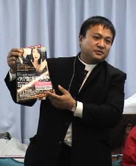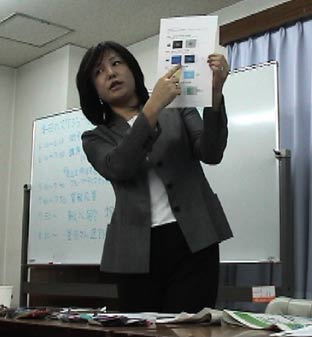 黒いパンツに白いシャツ、グレーのジャケットで登場した加藤さん。 良く見ると、藤原紀香に似ている(加藤さん言われません)。 会場もカラーコーディネーターの講演ということで 気のせいかいつもの例会よりも服装に意識した参加者が。 大熊さんも、よりすぐりのジャケット姿?かく言う私もベージュでまとめていた。 80分と限られた講演の中で「色の基礎知識」から「売れる商品・・・その秘密」、「生活環境にふさわしい色」、「売れる色の空間作り」そして、加藤さんの色へのこだわりを私たちに伝えようと のっけからハイスピードの講演だった。 (岡田さん記) |